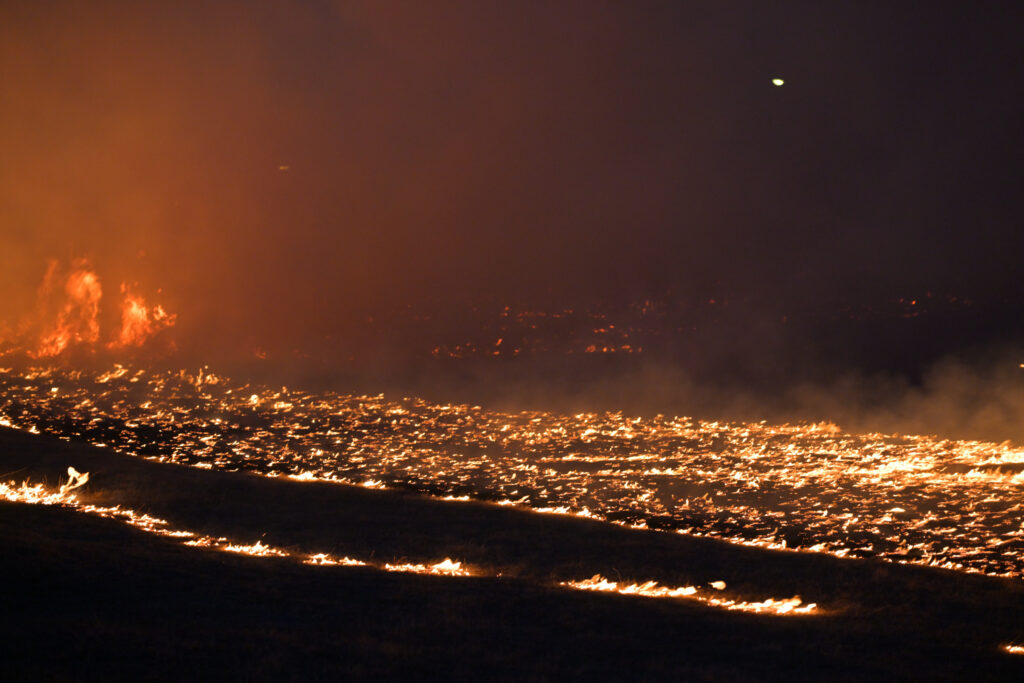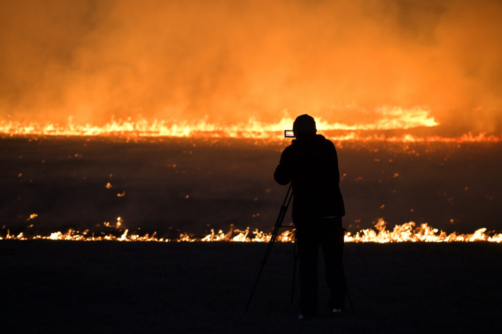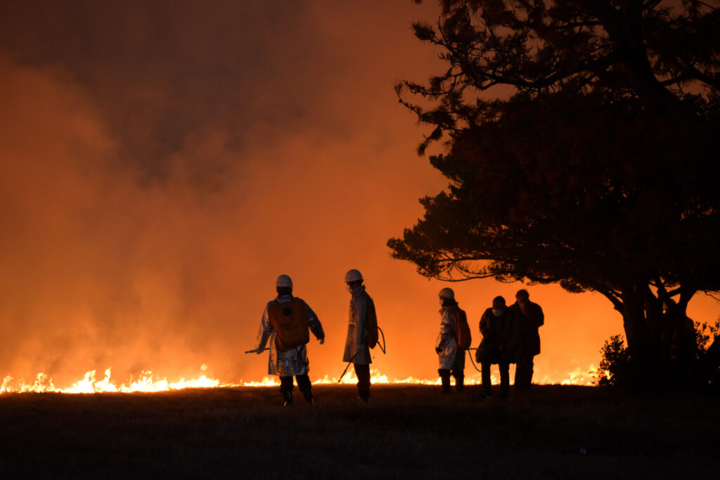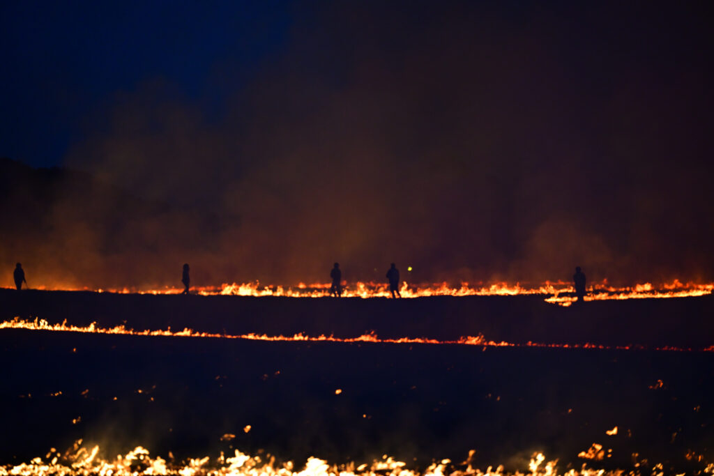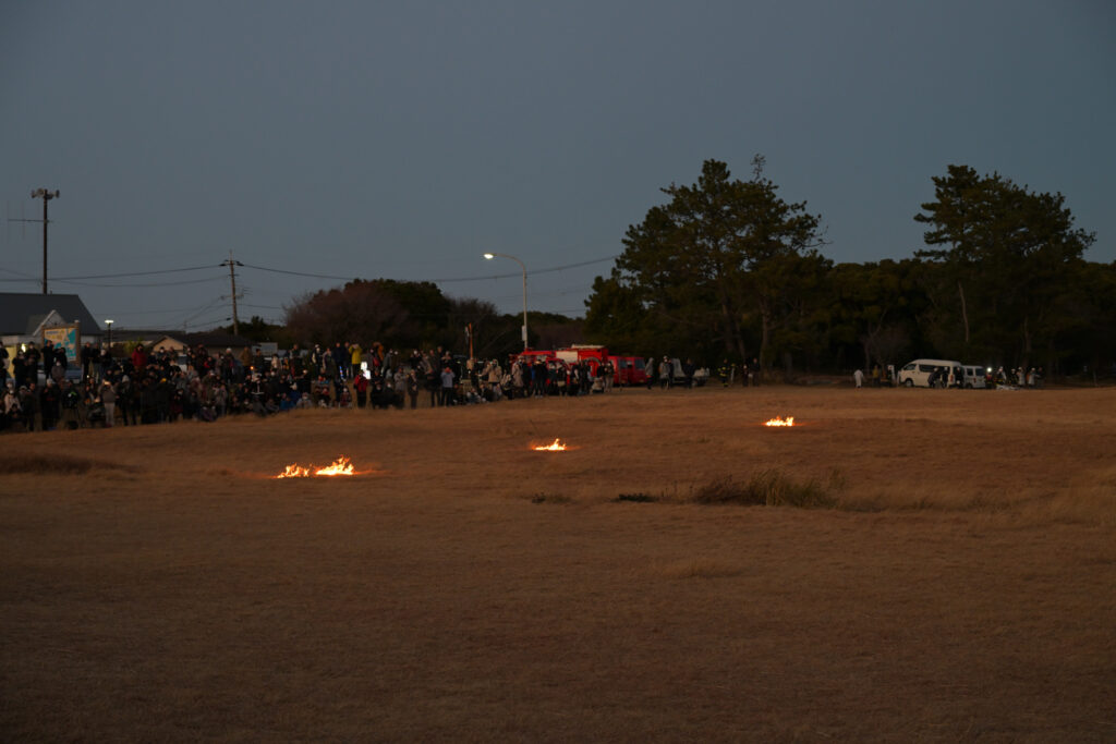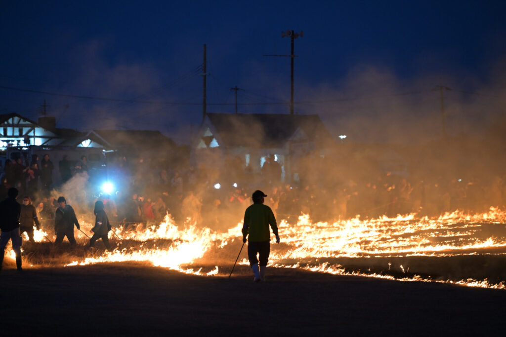 芝生を焼く最初の火は火矢によって放たれます。芝生に突き刺さった矢からみるみる炎が燃え広がっていき、30分もしない内に区画内を焼き尽くしてしまいました。野焼きは普通昼間に行いますがこの祭りは暗くなってから火を放つので炎の明るさが際立ってとてもキレイです。ちゃんと消防隊の人たちが区画の外まで燃え広がらないよう管理しているため安全ですが、炎はすぐ目の前までやってきました。あと運営側のカメラマン(?)みたいな人たちも区画内にいたのですが、シャッターチャンスを逃すまいと走り回っていて面白かったです。あれだけ燃え広がるのが速かったら様々な角度から撮るのは大変だろうなと思います。