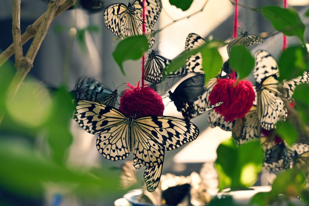 これまでに何か所か昆虫館と呼ばれる場所に行ったことがありますが、どこも必ず温室があってそこに蝶を放っていますよね。今回行った橿原市昆虫館の温室はこれまで行ったとこと比べてもかなり大きい方でした。そして蝶の数もかなりのものです。あと何故か私の周りにやたらと蝶が寄ってきて、立ち止まって写真を撮っていると2~3匹くらい体に止まられる状態でした。他の客で止まられている人はあまりいなかったのですが、おかしいですね。何か変なにおいでも発しているのかと心配になりました。