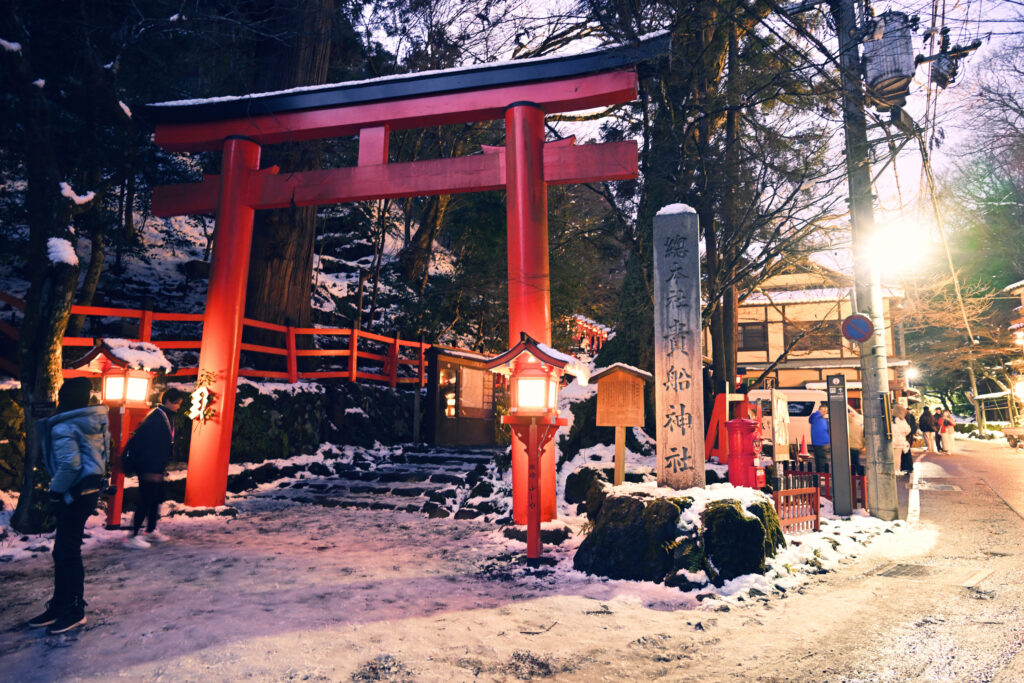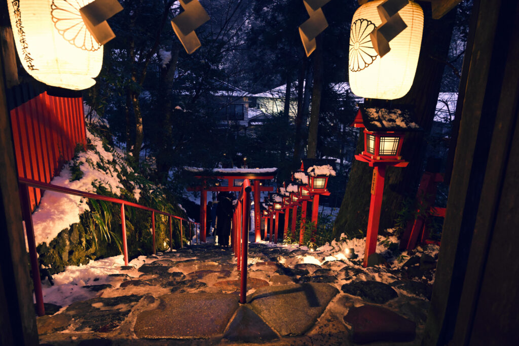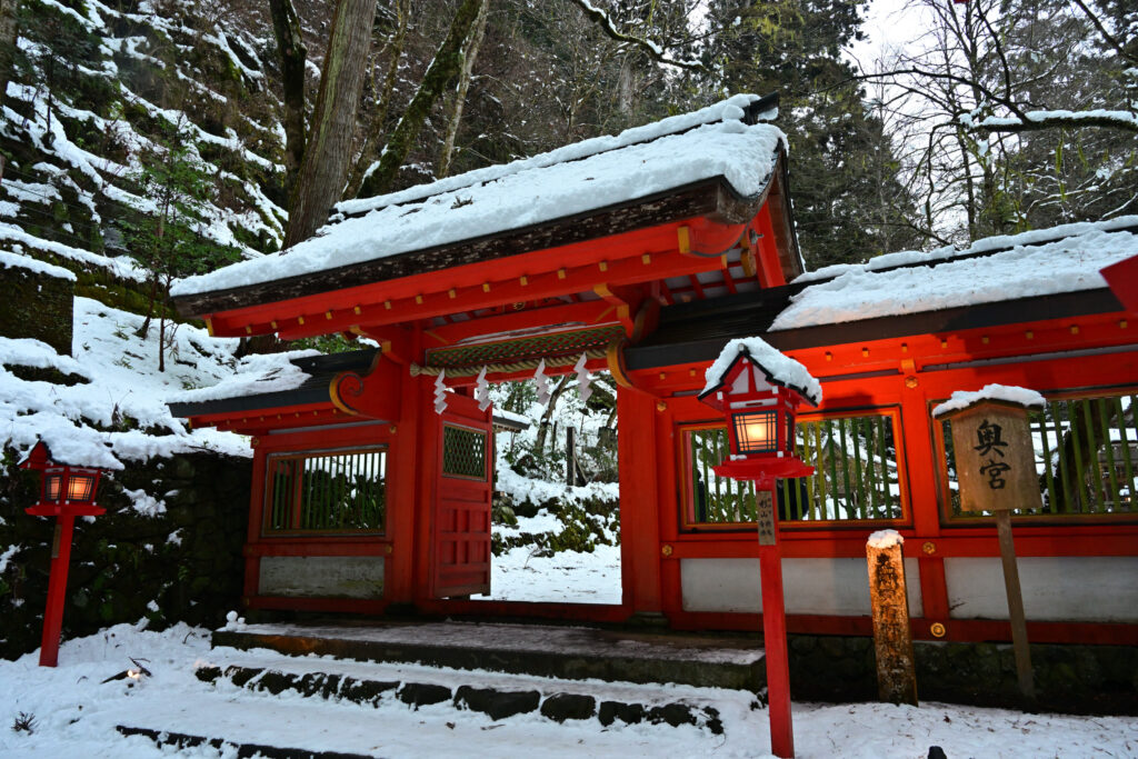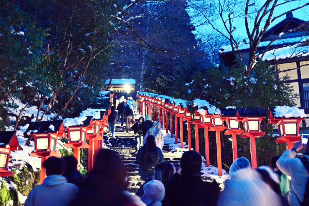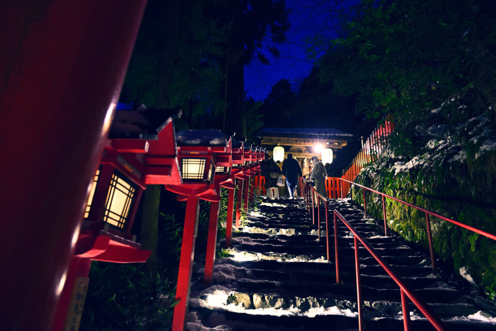 まあ、そうはいっても私が出かけようと思った2/9(日)は京都の中心らへんはほとんど解けていそうでしたので、まだ雪が残ってそうな山の方にある貴船神社を目指すことにしました。貴船神社は2年くらい前に行ったことはありますが、その時は確か夏の終わりくらいの時期でしたので冬の貴船神社は初見です。現地へ到着すると思っていた通りまだ雪がけっこう残っていました。しかもこの貴船神社ですが、雪が降ったときだけライトアップするらしいです。雪景色の中、光る灯篭は幻想的な雰囲気で良かったですが、やはり皆それを目当てにやって来ているようで灯篭の並んだ階段付近は以前来たときとは比べものにならないくらいの人でごった返していました。せっかく三脚を持ってきていましたが結局使えず仕舞いです。人の集まるところで写真を撮るのはなかなか難しいものですね。