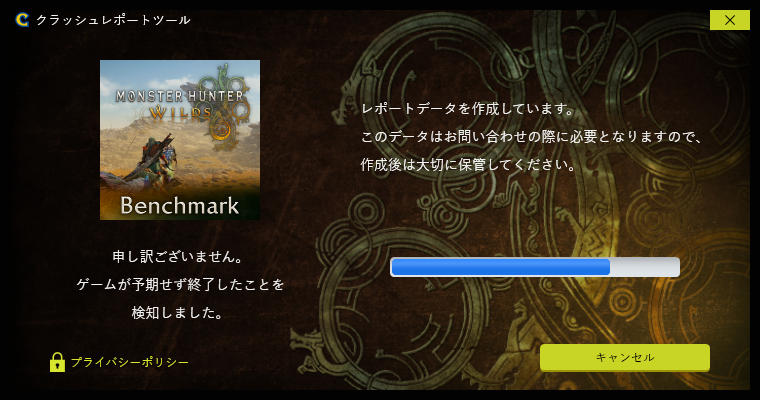ベンチマークを実行するだけなのですぐに終わるかと思いきや、いきなり以下のエラーがでてベンチマークがクラッシュしてしまいました。