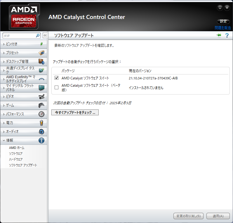 「21.10.34-210727a-370439C-AIB」というのが現在のドライババージョンみたいです。AMDのHPで調べても一致するものは見つかりませんでしたが、おそらく左側の「21.」から察するに2021年にリリースされたバージョンでしょう。2021年からドライバ更新していないなんて・・・・