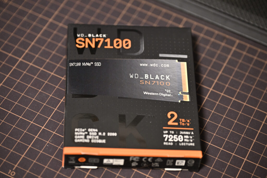 購入したのはWD製SN7100シリーズの2TBのSSDです。ネットで評判が良さそうだったので選びました。ちょっと値段は高いですが安物を買ってある日突然データがクラッシュする羽目になるのは嫌ですからね。メインのストレージにはしっかり金をかける方針です。
