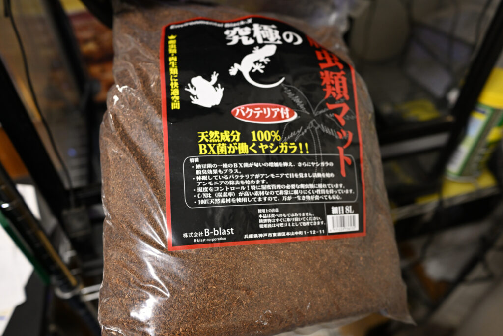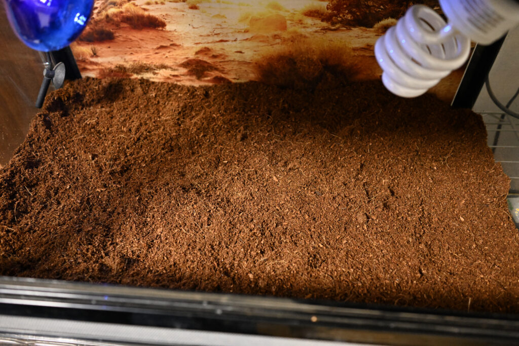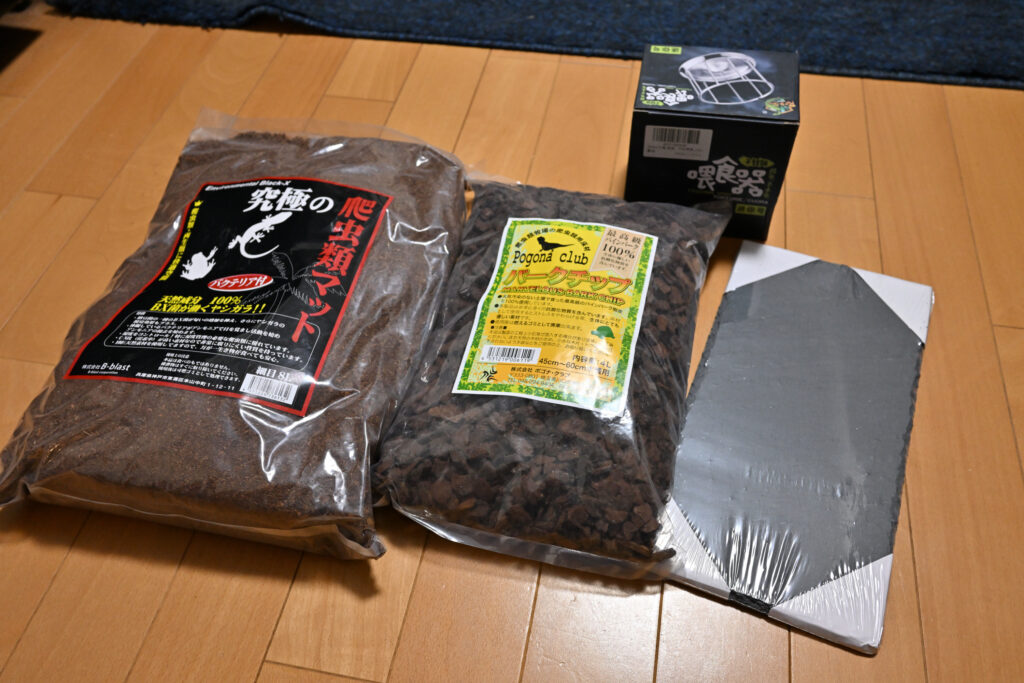ここに新しく買ってきた床材を入れていきます。まず最初に入れるのはこちら、土系の床材です。土系の床材は温度や湿度を保ちやすいというメリットがあるようです。