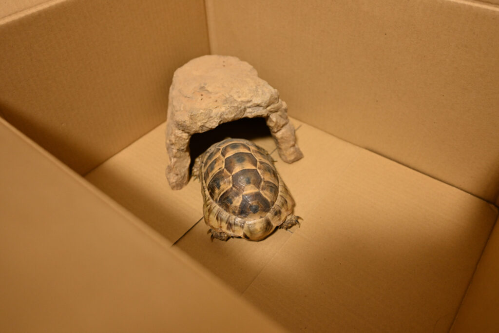 まずは今の床材を掃除するためにリクガメを待避させます。ちょうど購入した品々が届くときに入れられていた段ボールが良いサイズだったのでそこを待機所としました。
