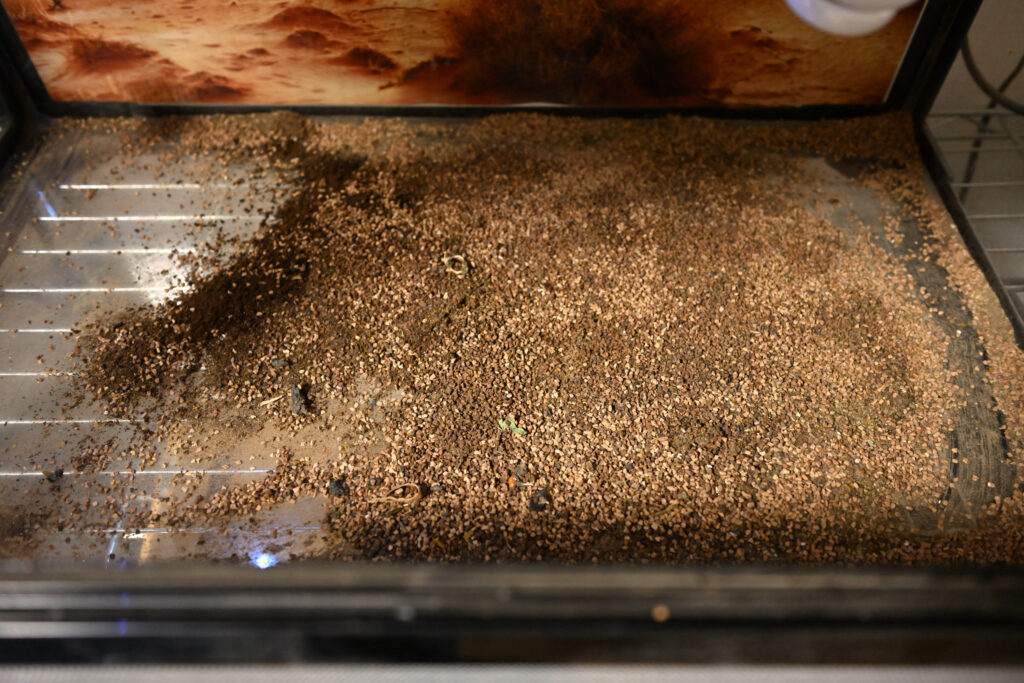 今使っている床材はクルミの殻を砕いたウォールナッツサンドという床材です。前回と前々回入れ換えたときも確か同じ床材だったと思います。かれこれ1年以上はこの床材で過ごしているような気がします。ただこの床材、YouTubeのレビュー動画を観ているとあまり評判がよろしくありません。誤飲しやすいのと粉が宙に舞いやすいのがマイナスポイントのようです。製品の説明にはクルミなので食べても大丈夫ですと書かれてはいましたがやっぱり食べないに越したことはないということみたいですね。そんな訳で今回はしばらくお世話になったウォールナッツサンドに別れを告げて、別の床材に変更することにしました。引き続きYouTubeの動画で調べていると、けっこう多くの人が床材をブレンドして使っているようでしたので物は試しということで私も床材ブレンドに挑戦してみます。