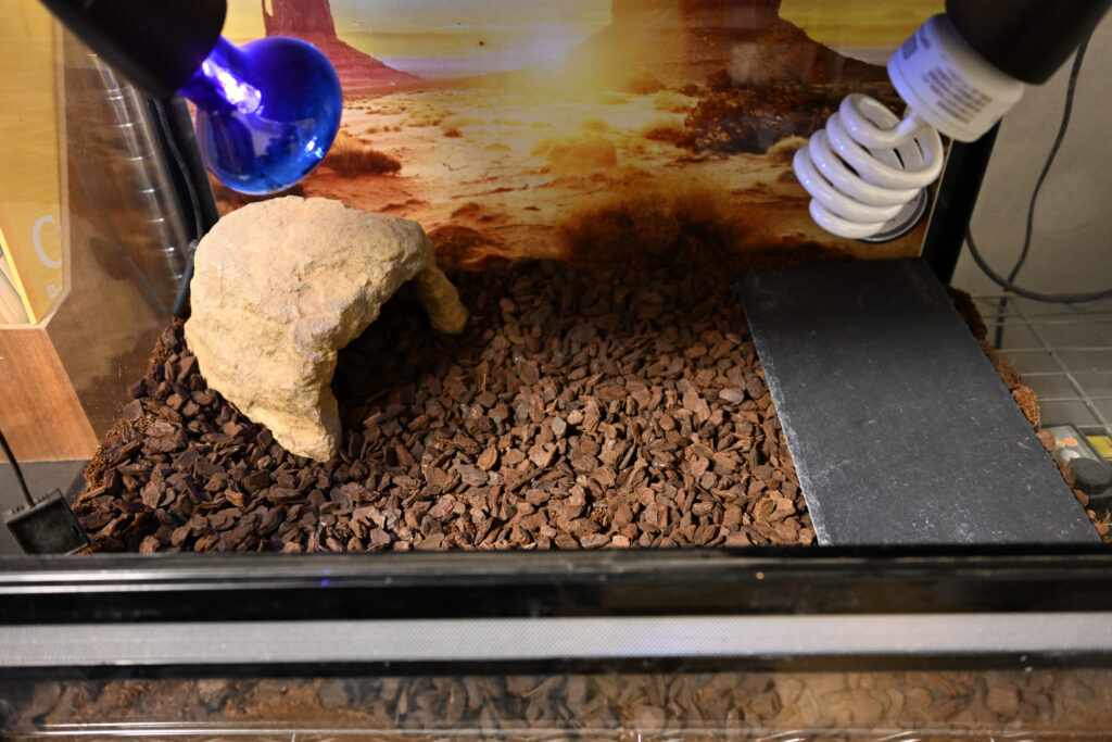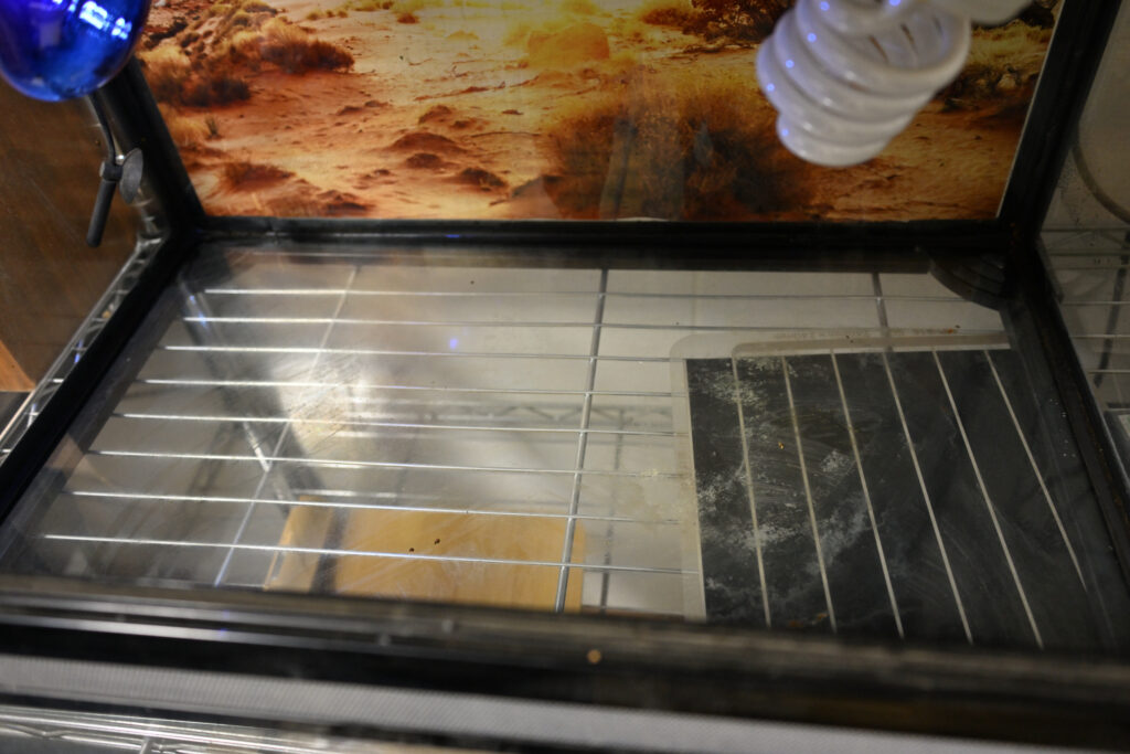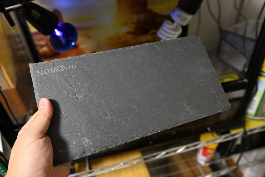 人工の床材だけだと柔らかいためどうしてもリクガメの爪が伸び放題になりがちなので、こういった固い床を用意してあげると自然と爪が削れてくれるそうです。代わりにレンガを使ったりする人もいましたがちょっと重くて棚が耐えられるか心配だったので比較的軽いこの石板を入れてみることにしました。